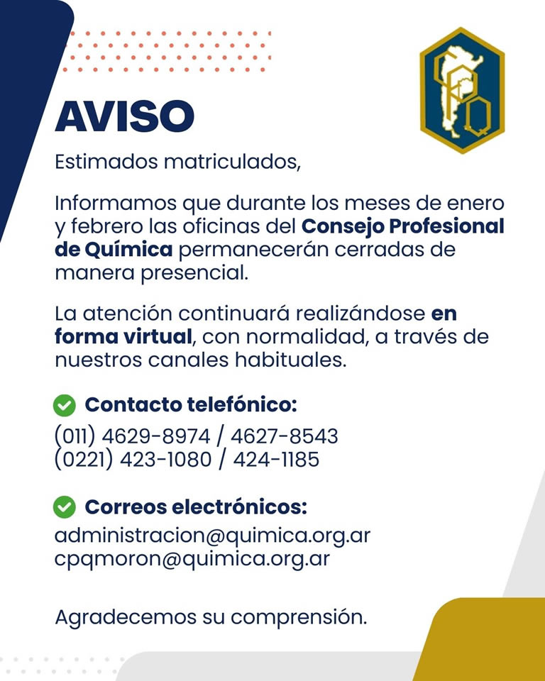 Solicitar su clave de acceso a info@quimica.org.ar, consignando su nombre y nro de matricula. 0221.423.1080 // 0221.424.1185