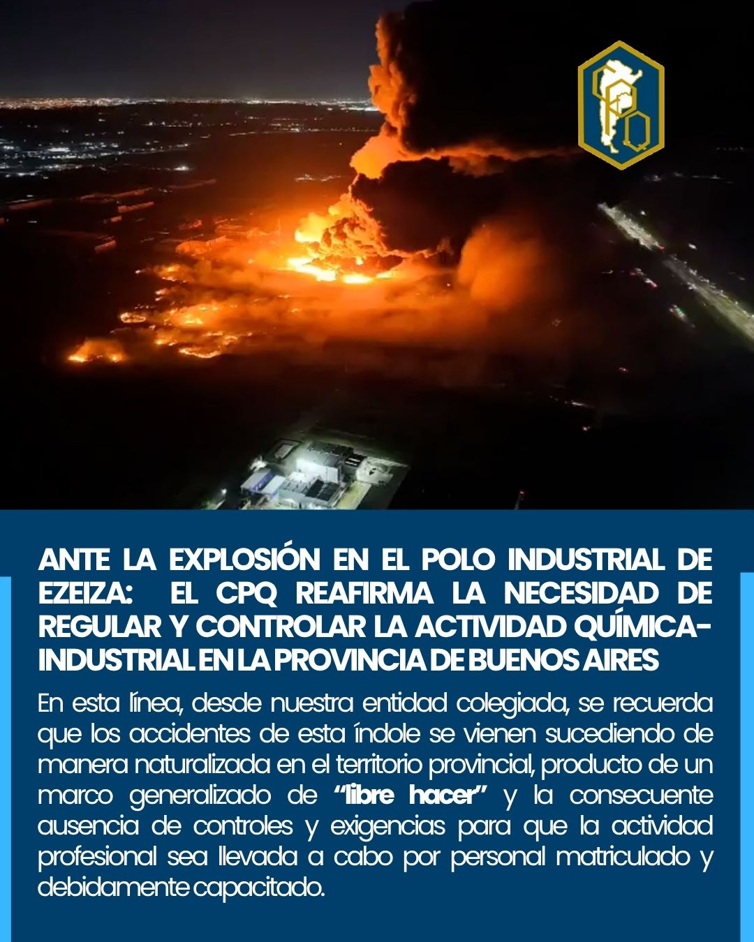 Ante la explosión que se produjo el viernes 14 de noviembre en el Polo Industrial de Carlos Spegazzini del partido de Ezeiza, el Consejo Profesional de Química de la Provincia de Buenos Aires reafirma la necesidad urgente de regular la actividad química-industrial de la provincia de Buenos Aires, conforme a la Ley y a los protocolos de seguridad y ambientales vigentes.